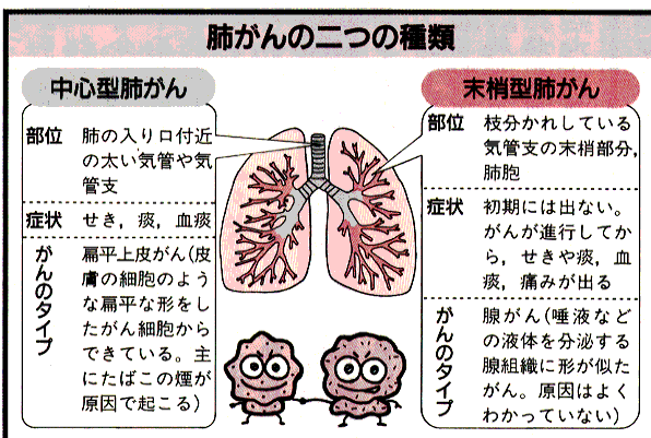 肺は、中央の太い「気管」と、気管が左右に枝分かれしてできた「気管支」、そして、気管支の末端部分に、ブドウの房のように寄り集まった、球形の「肺胞」で構成されています。この中で、気管と、細かく枝分かれする前の比較的太い気管支にできるがんを「中心型肺がん」といいます。肺がんは、がん細胞のタイプによってもいくつかに分類されますが、中心型肺がんに多いのは「扁平上皮がん」という種類です。これは、皮膚の組織のように扁平な形をしているがん細胞です。このがんの発生には喫煙が深く関係しています。 中心型肺がんは自覚症状があるのが特徴で、比較的早期でも、「席」「痰」「血痰」などの症状がでます。ただ、この症状がかぜによく似ているため、前記のような症状がいつまでも続き、かつ、熱や鼻水といったほかのかぜの症状がない場合には、中心型肺がんの可能性も考えられます。