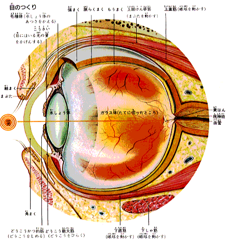 毛様体・・・・レンズの厚みを調節する部分でこれが焦点を合わす役目をする。