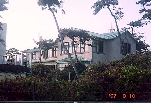 森戸海水浴場と一色海水浴場の間の芝崎に建っています。 窓ガラスはドイツ製、床の大理石はイタリア製と建築材料は すべて外国から取り寄せたそうです。(葉山町一色)