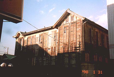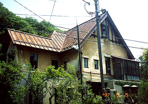 鎌倉駅のすぐ近くにあります。写真ではわかりませんが、 屋根は大分破壊が進んでいて、もはや「はとの館」と化しています。 よく見ると凝った意匠で、現役のときはさぞ立派な建物だったと思います。 病院であったようです。 (鎌倉市小町)