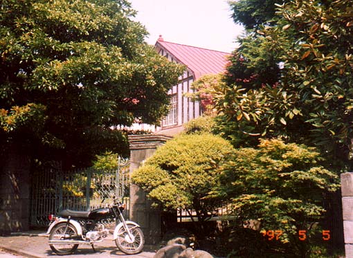 資料がなくて建物の設計者、施工者、竣工年はわかりません。 赤いマンサール屋根(途中で傾斜角度の変わる屋根)とハーフティンバーが特徴です。 この邸も周りが樹木で覆われていて、敷地内へ入らないといい写真がとれません。(鎌倉市大町三丁目)