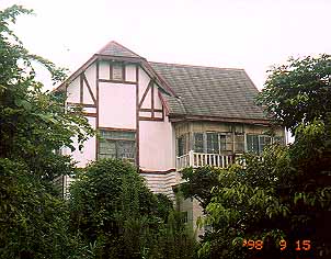 下見板張りの壁面、赤い縁取りの上げ下げ式の窓が見え、日本離れした雰囲気があり