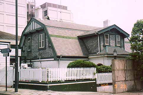 といったところでしょうか。 スレートの灰色、1Fの白壁、屋根や窓の枠の緑の配色が全体を非常にすっきり見せています。 本格的マンサール屋根は山手で唯一だそうです。 (中区山手町34)
