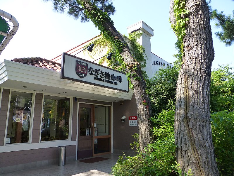 元逗子デニーズのあったところなので、ロケーションは素晴らしい。店から見た逗子の海とエントランス。